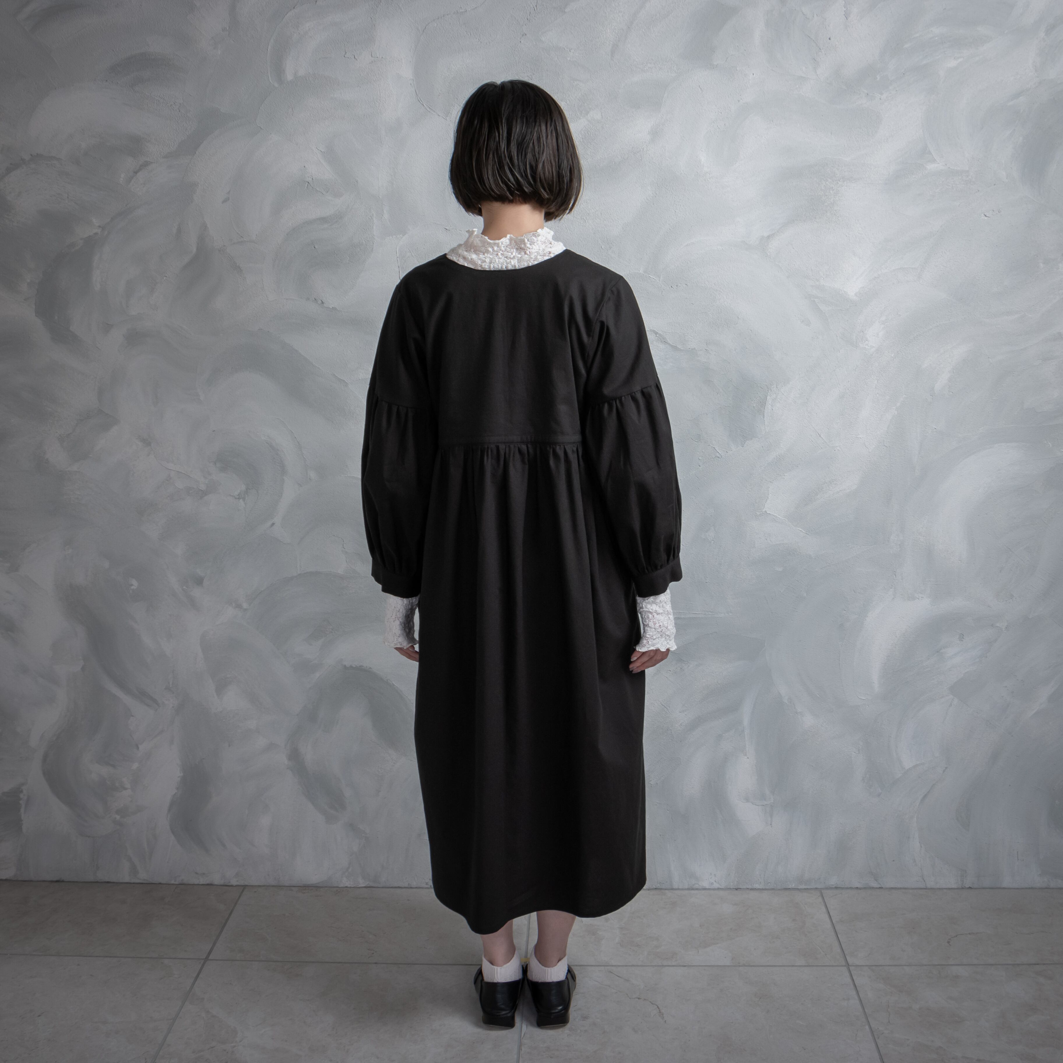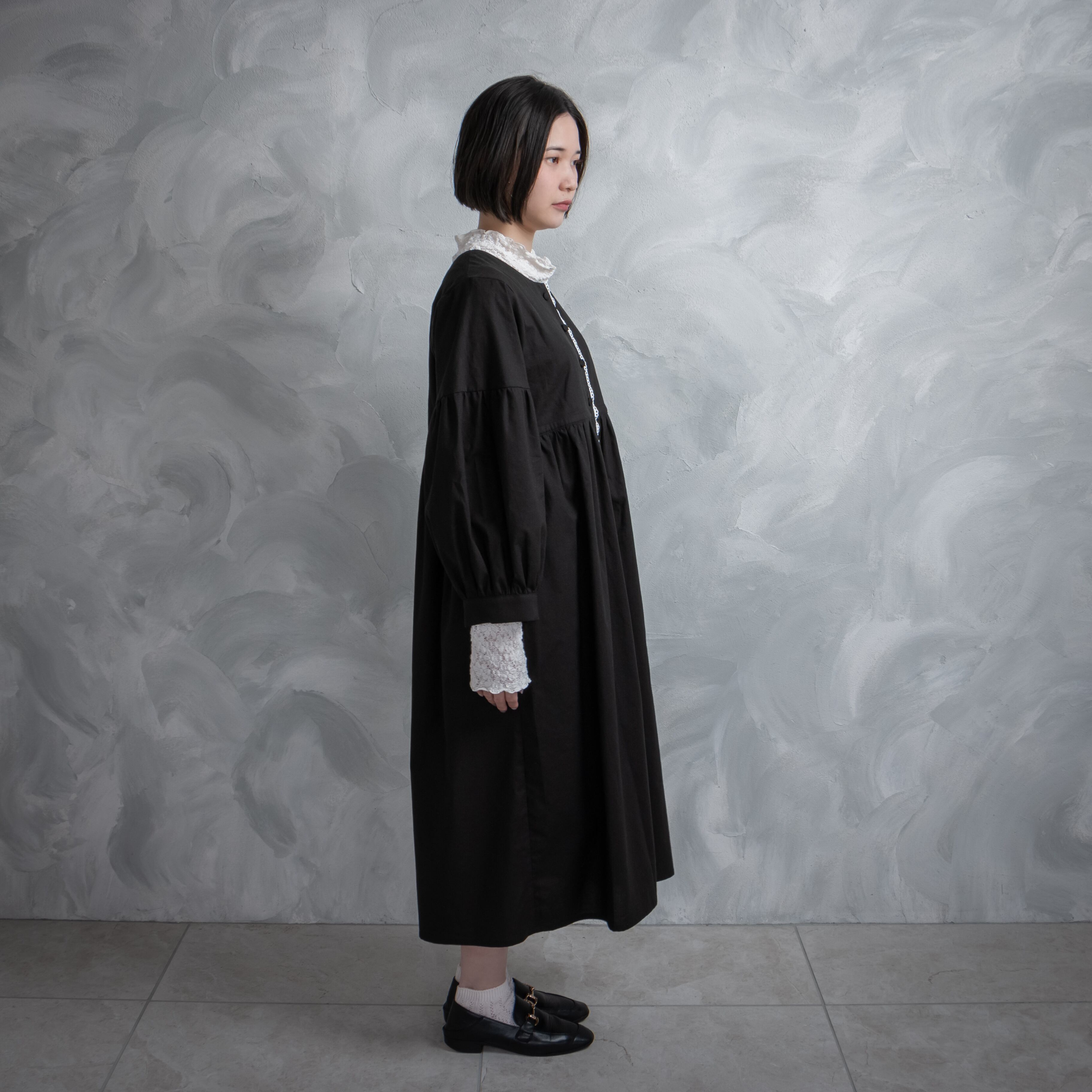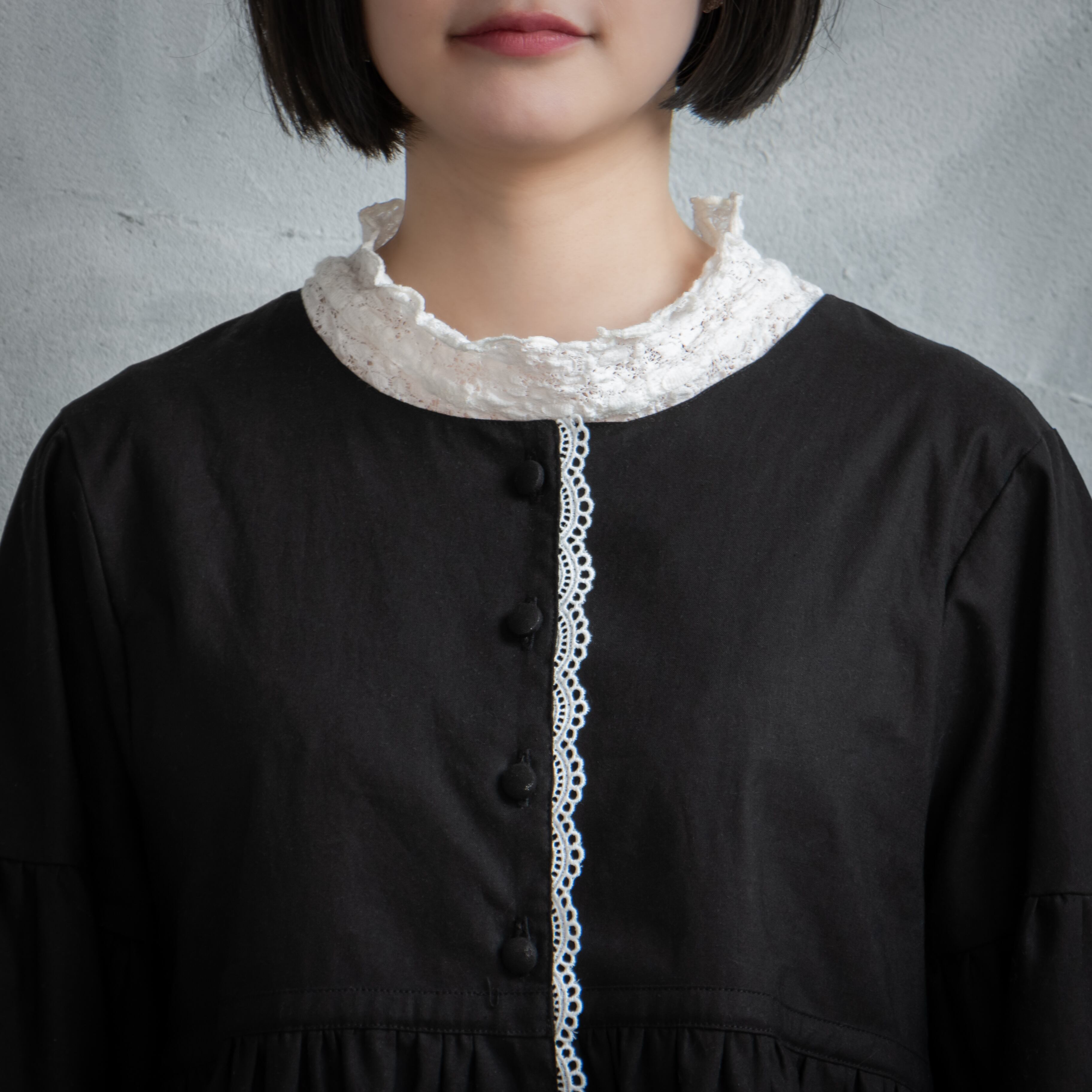 前立てに沿ったコットンレースとくるみボタンが愛らしいデザインのワンピースです。